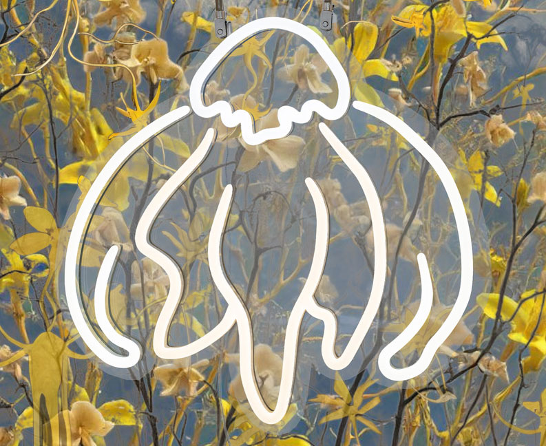 Im Zentrum steht das Motiv der Orchideen – hochgradig mutualistische Arten und Symbole der Vernetztheit. Anhand dieser beleuchtet die Installation die verwobenen Kräfte von Natur, Technologie, Handel und Ästhetik.