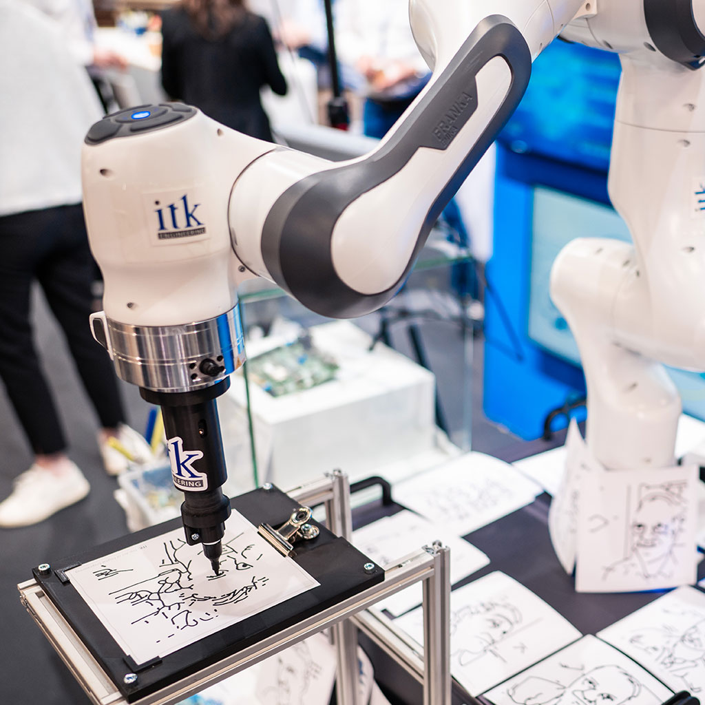 Während der Demonstration wird mit einem Tablet, das über eine Webcam verfügt, ein Porträtfoto aufgenommen. Das Bild wird direkt auf einem integrierten Mikrocontroller vorverarbeitet und anschließend in die Cloud übertragen. Dort wandelt ein KI-basierter Algorithmus das Foto in eine Strichzeichnung um. Diese wird dann an den Robotercontroller gesendet, der passende Bewegungsbahnen berechnet, sodass ein am Roboter montierter Stift die Zeichnung originalgetreu auf Papier reproduziert.